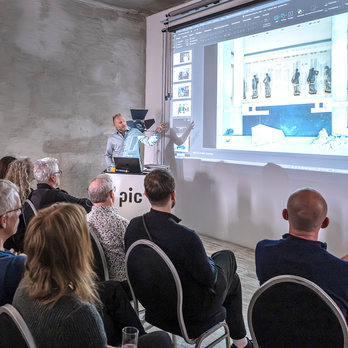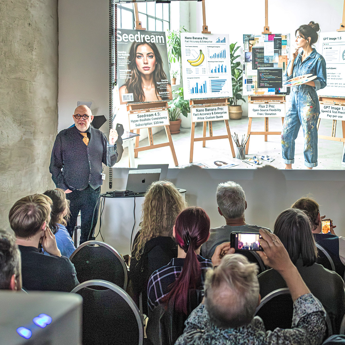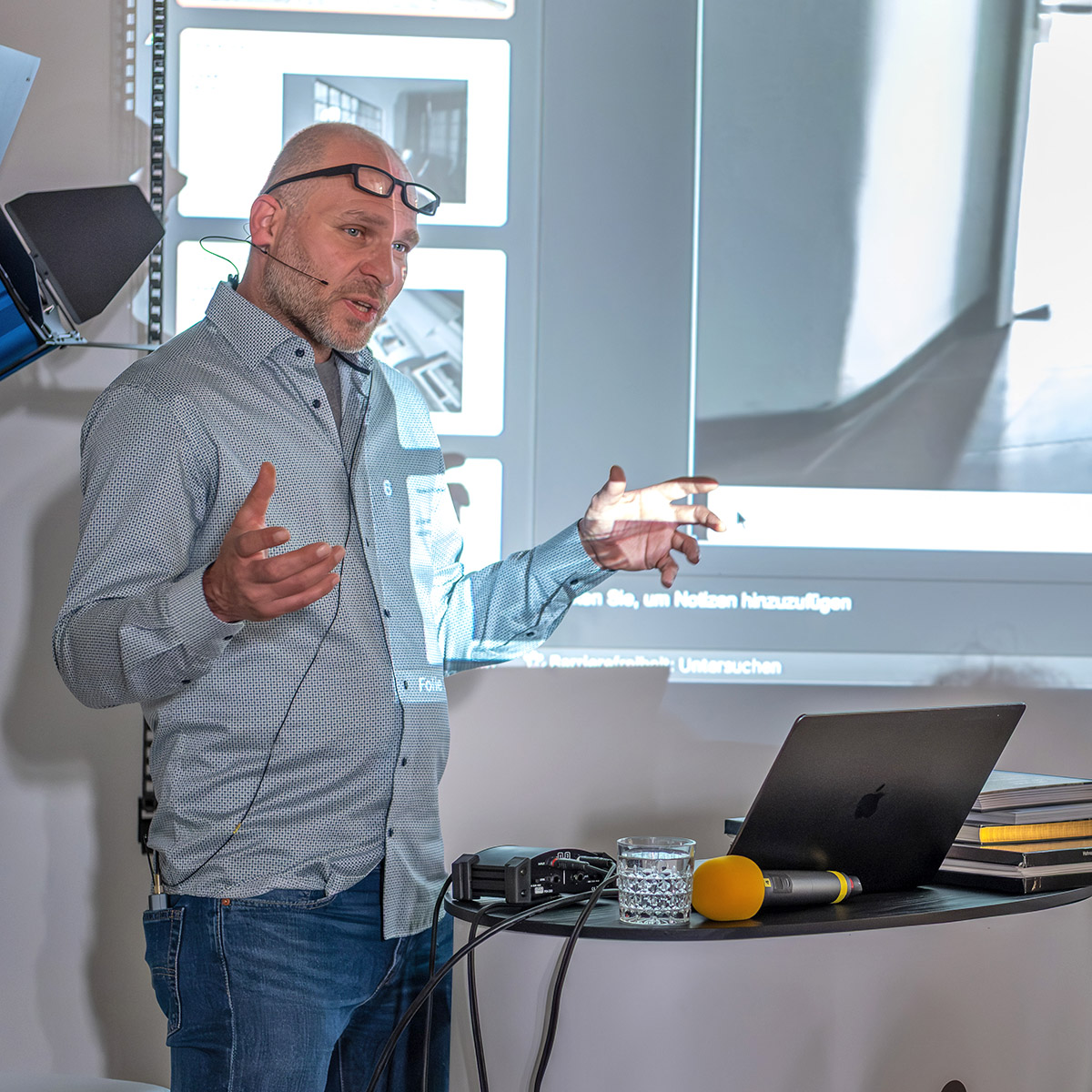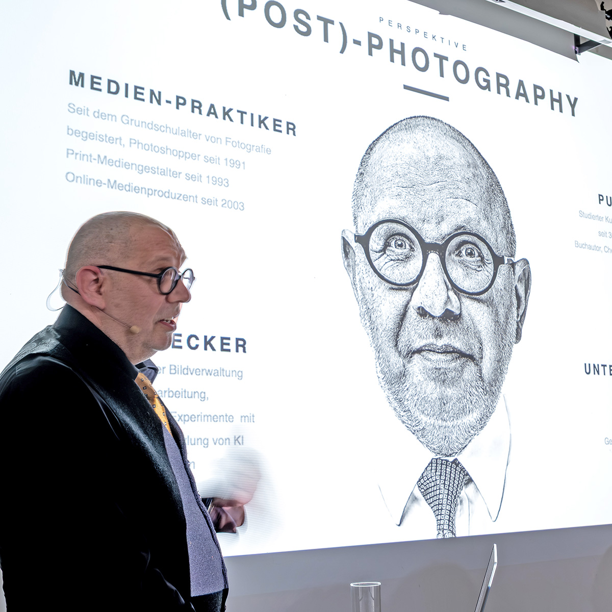 Zum zweiten Mal zu Besuch bei uns war auch Christoph Künne, seines Zeichens Kulturwissenschaftler, Gründer und Chefredakteur des Magazins DOCMA. Er vermittelte uns einen spannenden Überblick über die Situation im aktuellen KI-Markt, die Möglichkeiten der interessantesten Tools und gab Auskunft auf die Frage, inwieweit KI zusätzliche Arbeitsfelder und praktische Vorteile für Fotografen bieten kann. Seine Botschaft: „Technologie ist immer nur ein Teil der Gleichung. Mindestens ebenso wichtig sind die Fähigkeit zur kritischen Reflexion, die Bereitschaft zum lebenslangen Lernen und der Mut, etablierte Strukturen zu verlassen, wenn eine neue Ära anbricht.“