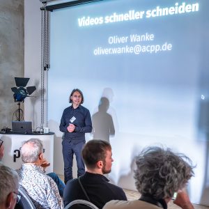 PIC-Mitglied Oliver Wanke war es dann auch, der uns in seinem extrem nützlichen Vortrag Praxistipps zum schnelleren Schneiden von Videos gab. Ein schneller Workflow kann schließlich dafür entscheidend sein, ob ein Projekt sich rechnet oder nicht. Oliver Wankes Werkzeug ist Davinci Resolve, aber die meisten gezeigten Operationen funktionieren ebenso in anderen Schnittprogrammen.